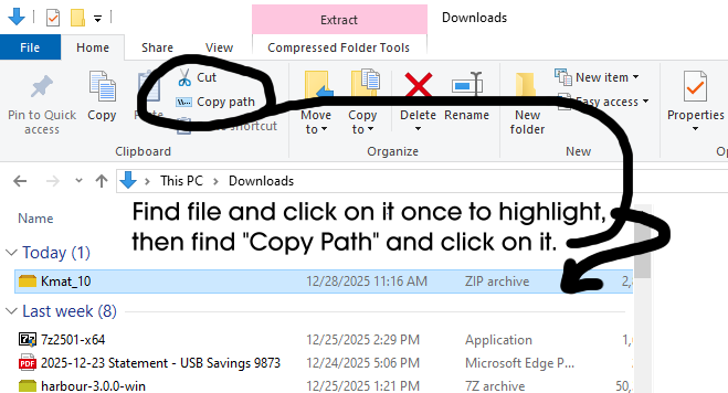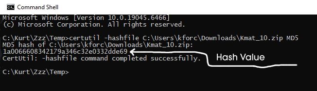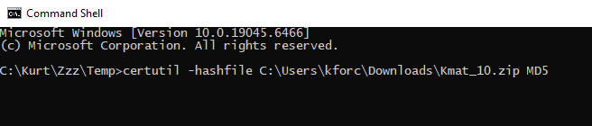 * Note * This is for those not comfortable with how to install a "Zip" download file. Those with an un-zip util and hash checking program, can skip this tutorial and use your normal tool set. Part_1 : Need to find the downloaded "Zip" file and copy it's full path. Open Windows "File Explorer" and navigate to the location the zip file was downloaded. Usually this is c:\users\your_user_name\downloads\kmat_10.zip". Example: ![]() Click on the file, depending on version of Explorer and Win-10 or Win-11, you need to find the option to "Copy Path". Some versions it is a menu bar item, others a right mouse click option. Example: ![]() Another option is to create a desktop shortcut and then open properties and copy path. or properties from explorer when on the file, and copy the path. *** You need to have the full path including file name and extention. *** *** Copy into memory so you can later paste.*** Part_2 : Check file's hash. Next you need to open the CMD window, type CMD in Search then enter. or Windows Key & "R", Type CMD, then OK or Enter. Example: ![]() Once in the command window, type: certutil -hashfile (then paste the above path to the line) then type one space and "MD5" The line should look something like this: certutil -hashfile c:\Users\your_user_name\downloads\kmat_10.zip MD5 Example: ![]() Press the enter key It should echo a newly created hash value to compare with hash number on the Kmat download page. Windows (certutil -hashfile), displays the hash lower case, normal order. Example: ![]() Note: Above is an example. Some hash programs show the output in upper case and some even reverse the string right to left Many let you pick the output (upper, lower, normal, reverse) Be sure to compare apples to apples if using another hash program. Part_3 : UnCompress to working folder. Most Un-Compression programs allow you to pick an extraction location, moving the file might not be necessary. If necessary copy or move the Zip file to location you want the program to be installed. Use Explorer or any un-zip utility and un-compress the main file and sub folders. In Explorer locate and while on the file right click and select extract as the option. In most versions of Windows Explorer it has the option of where to extract the files. After extraction you should see the main application Kmat_10.exe and 3 folders Pictures, Icons and Lic_Code. Example: ![]() Next create a shortcut for the desktop or place in folder for using the program. To uninstall just delete main folder with all files and sub folders and erase any shortcut's you made. Enjoy, and feel free to eMail with any questions, suggestions, etc. Contact : kurt@kurtebertphoto.com Web : http://www.kurtebertphoto.com/kmat/ |